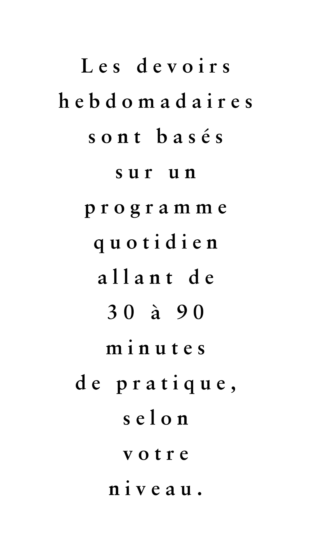 Les devoirs hebdomadaires sont basés sur un programme quotidien allant de 30 à 90 minutes de pratique, selon votre niveau.