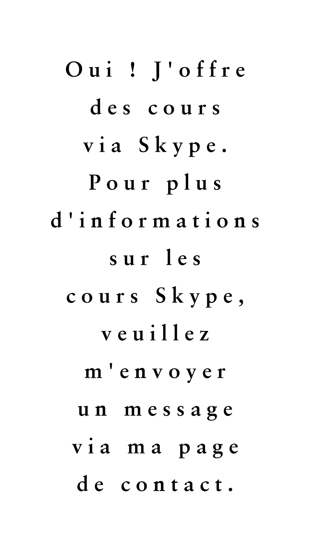 Oui ! J'offre des cours via Skype. Pour plus d'informations sur les cours Skype, veuillez m'envoyer un message via ma page de contact.